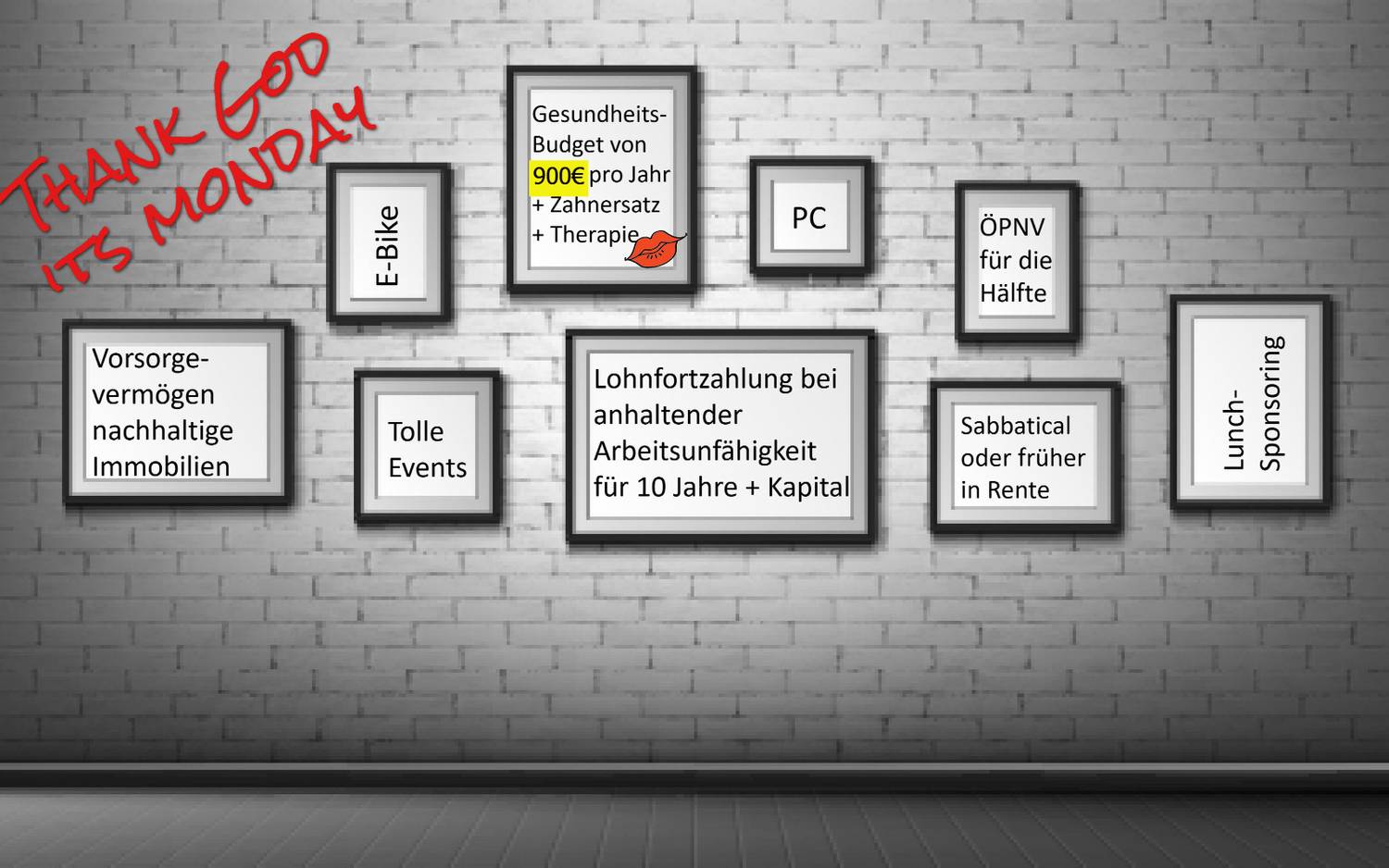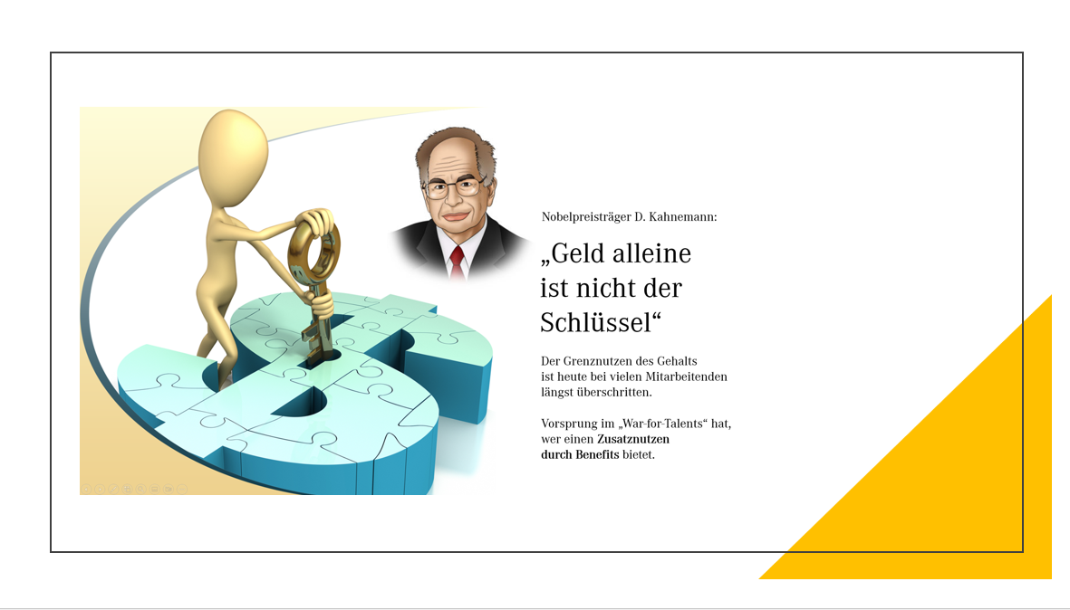 Falsch ist es deshalb, wahllos irgendwelche "Goodies" zu verteilen. Tankgutscheine, Obstkörbe und der berüchtigte Tischkicker sind leider immer noch an der Tagesordnung der Gedankenlosigkeit. Benefits sind Ausdruck einer gelebten Unternehmenskultur und sollen dem Mitarbeitenden die Wertschätzung des Unternehmens ausdrücken. Der Arbeitgeber muss zum "Möglichmacher" von Zusatzleistungen werden, zu denen der Mitarbeitende als Einzelperson keinen oder nur sehr schwer Zugang erhält.