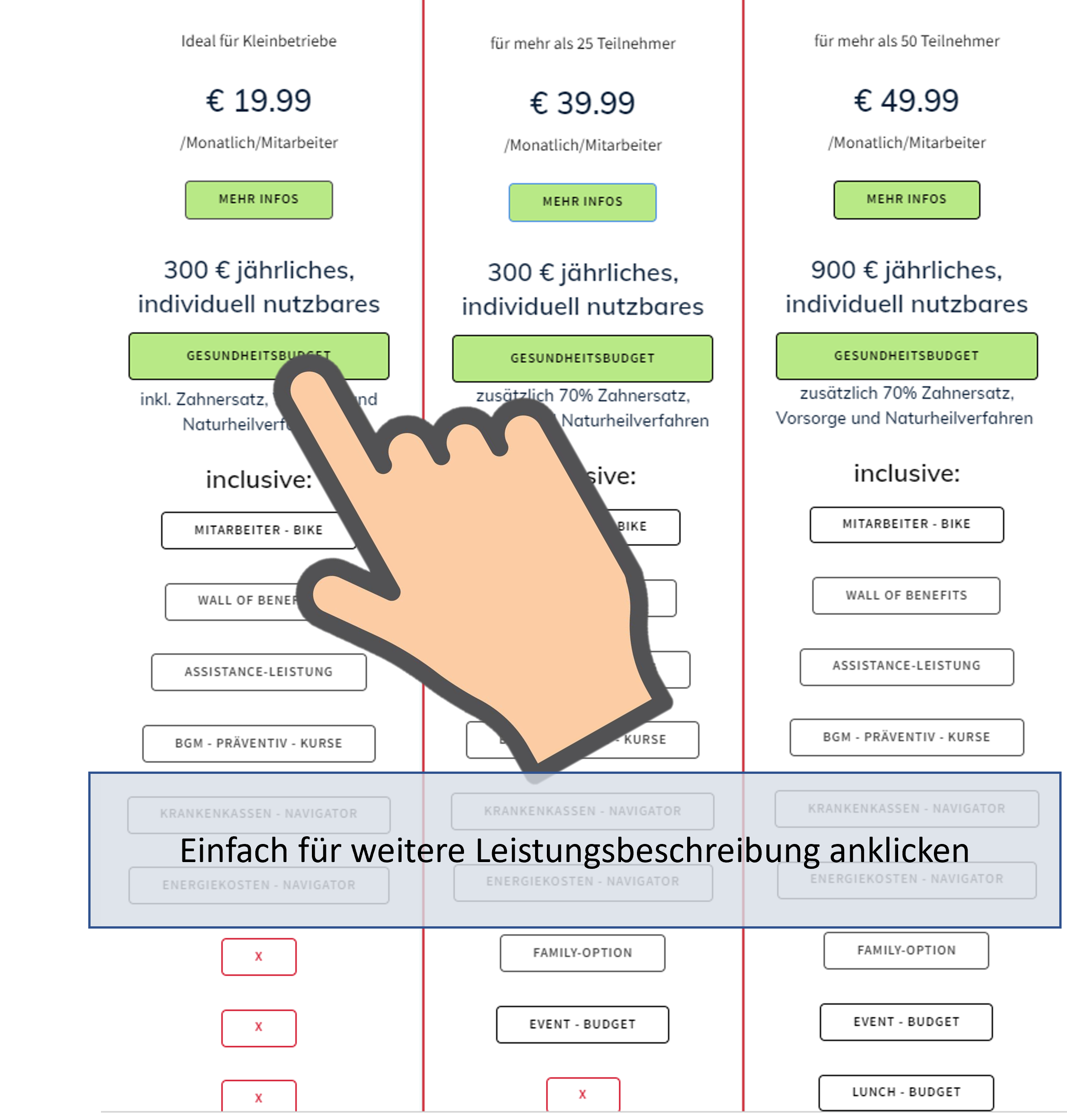 Machen Sie gleich das Benefit-Clearing. Das dauert keine fünf Minuten und Sie erhalten kostenfrei eine Beurteilung wie Ihre bestehenden Benefits in den Rahmenvertrag integriert werden können. Es verpflichtet zu nichts. Denn erst nach einer ausführ-lichen Information wissen Sie doch am besten, ob Sie uns brauchen.